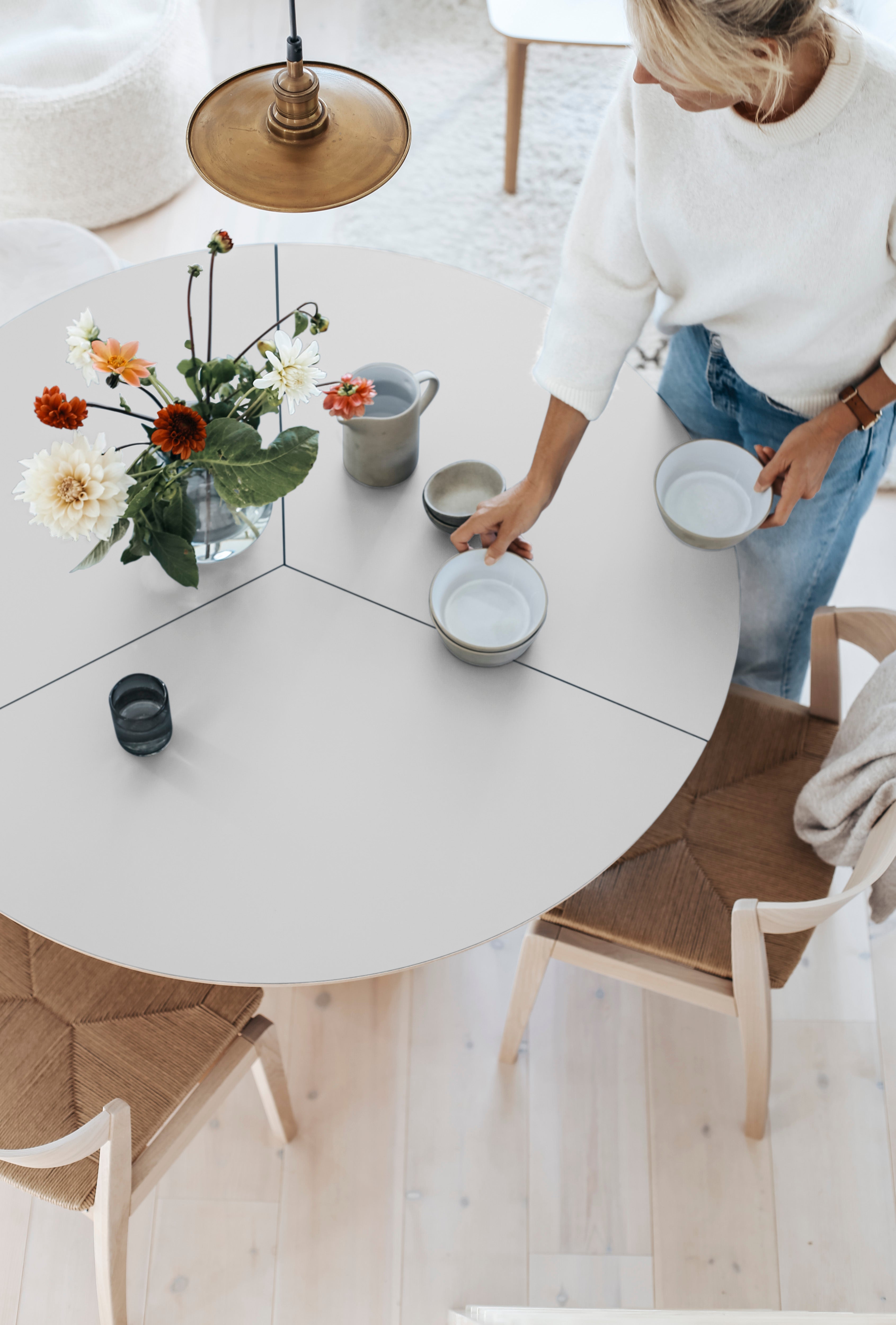 Deze tafel is uitgerust met een gepatenteerd, synchrone uitschuifsysteem. Trek het tafelblad uit elkaar om de verborgen uitschuifbladen in de voet vrij te geven en breng lichte druk aan om de bladen omhoog te halen en uit te vouwen. Zo creëert u eenvoudig extra ruimte voor uw gasten.