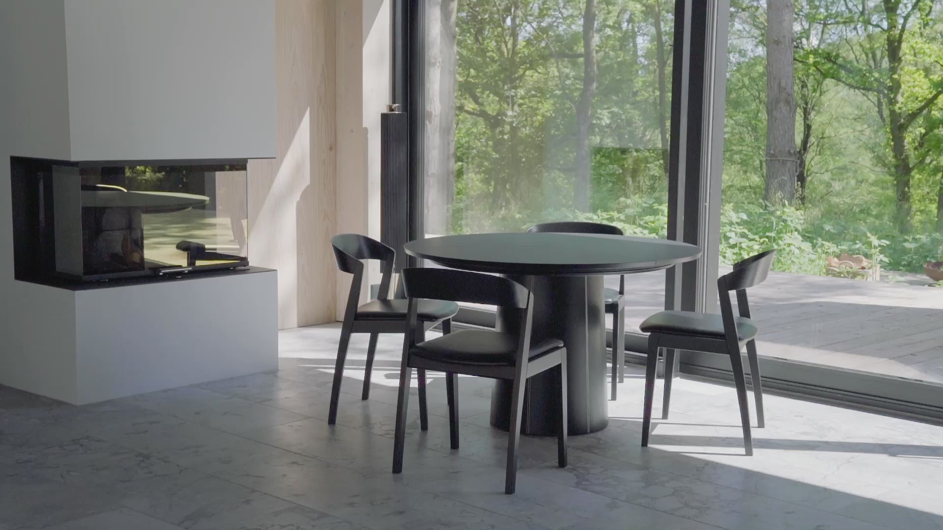 De skovby #33 eetkamertafel is voorzien van een uniek uitschuif systeem. door de draaitafel onder het rafelblad te draaien bewegen de drie bladen synchroon naar een positie die ruimte maakt voor de uitschuifbladen in de basis. bij lichte druk ontvouwen de uitschuifbladen zich door middel van een veer die onder de driehoek in het midden van de tafel is geplaatst. zo ga je op een simpele manier van 6 naar 9 zitplaatsen.