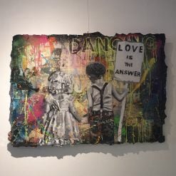 Dit kunstwerk symboliseert vernieuwing. Het werk bestaat uit een collage van onder andere gescheurde straatposters willekeurig in lagen geplakt, graffiti, stencils, verf & stiften, glitters en vele andere materialen. De felle kleuren van de posters steken af tegen gebrande plekken alsof tijd en chaos hun sporen hebben nagelaten. De ruwe, rafelige texturen geven het werk een ongepolijste uitstraling, terwijl het door de